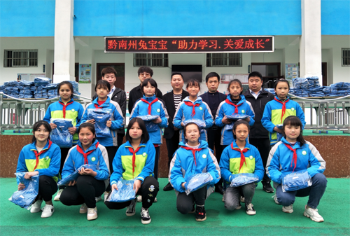 4月中下旬,兔寶寶裝飾材料銷售有限公司和貴州黔南州經(jīng)銷商一起來到都勻歸蘭水族鄉(xiāng),分別在陽(yáng)和小學(xué)、聯(lián)芒小學(xué)、塘泥小學(xué)等三所學(xué)校舉行愛心捐贈(zèng)儀式,捐贈(zèng)了夾克衫、鉛筆袋、雨傘等學(xué)習(xí)用品和生活用品,直接受惠750名學(xué)生。