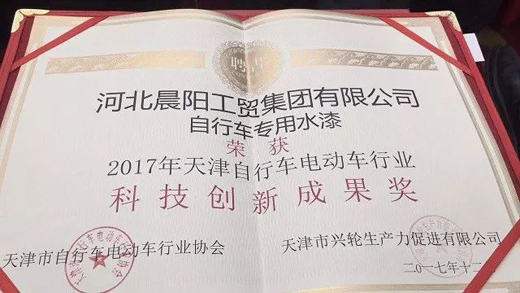 在2017年12月29日天津召開的“天津市自行車電動車行業(yè)協(xié)(商)會六(三)屆二次會員大會暨2017年行業(yè)科技工作會議”上,河北晨陽工貿(mào)集團(tuán)有限公司自行車專用水漆斬獲“2017年天津自行車電動車行業(yè)科技創(chuàng)新成果獎”。