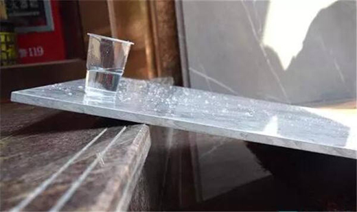 消費者對瓷磚的防滑性能自然會被關注。測評人員先找了個角度,放上瓷磚,在瓷磚上灑滿水。水珠清晰可見,然后放上一只水杯。水杯靜置且不滑落。家居瓷磚對防滑性的要求,這款特斯拉灰一定合格。