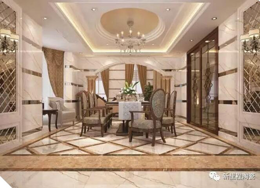 通體大理瓷磚,質感厚重,特別適合空間較大的住宅或高檔商用空間,通體大理石瓷磚已應用在別墅、高端酒店、餐廳、會所等高端場所。此外, 通體大理石磚硬度較高,也同樣適用于人流量較大的公共場所,如商場等。