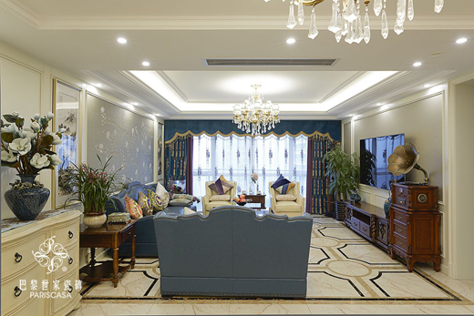 客廳中色彩搭配豐富,以巴黎世家索菲特金為主導色調,線條勾勒流暢的藍色沙發,優雅自然的簾飾襯托呼應,代表美式風情的碎花墻紙,在空間中打造出強烈的視覺沖擊力。
