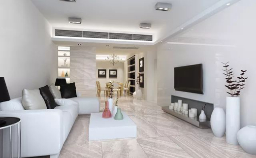 簡斯托輕奢石系列的雪花大理石用在餐廳,方形鋪下地,搭配回字紋包圍打線,打造簡歐風格低調的奢華。