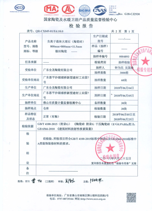 國家陶瓷及水暖衛浴產品質量監督檢驗中心,是中國實驗室國家認可委員會(CNAS)認可的實驗室、國家認證認可監督委員會指定的瓷質磚CCC強制認證檢測機構,也是中國質量認證中心(CQC)、方圓認證中心、中國環保產品認證中心等認證機構簽約的實驗室,同時獲得了歐洲CE認證和SASO認證等出口產品的檢驗資格。