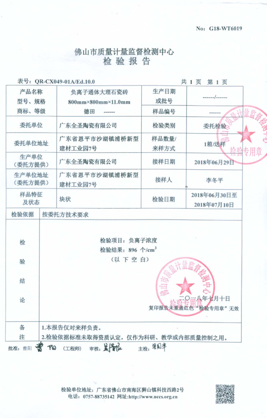 德田陶瓷負離子通體大理石瓷磚經權威機構實驗證明,負離子釋放量達896個/cm³,該濃度達到有效增強人體免疫力的水平。