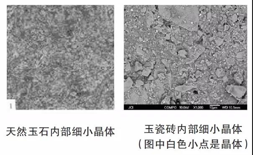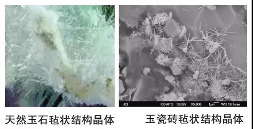 玉瓷磚表面質(zhì)感及觸感像玉石一樣溫潤(rùn),是因?yàn)樗鼉?nèi)部還有近似玉石一樣的“氈狀結(jié)構(gòu)晶體”。
