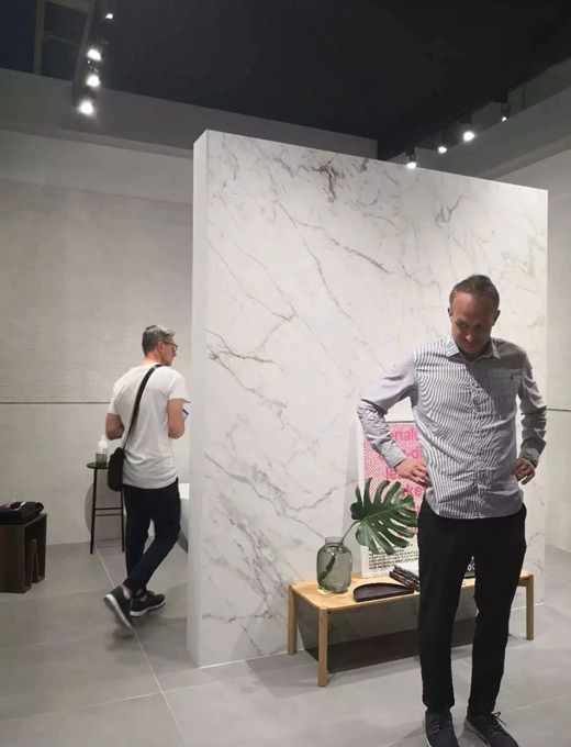 尹虹博士在分析今年博洛尼亞展會產品趨勢時表示,大規格陶瓷已經成為主流。幾乎所有的知名品牌都有大板展示,大家更多在展示大板的功能與應用,因此在展會上可以看到很多的廚衛、衣柜與臺面的陶瓷大板應用。1200×1200的大磚隨處可見,很多參展商展示了500×1500的內墻磚,馬拉齊這次展出了600×1800的內墻磚。可以說在中國消費一直追求大規格的影響下,大規格瓷磚已經成為世界瓷磚消費的潮流。