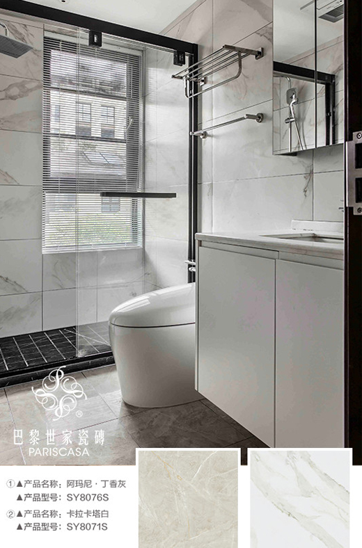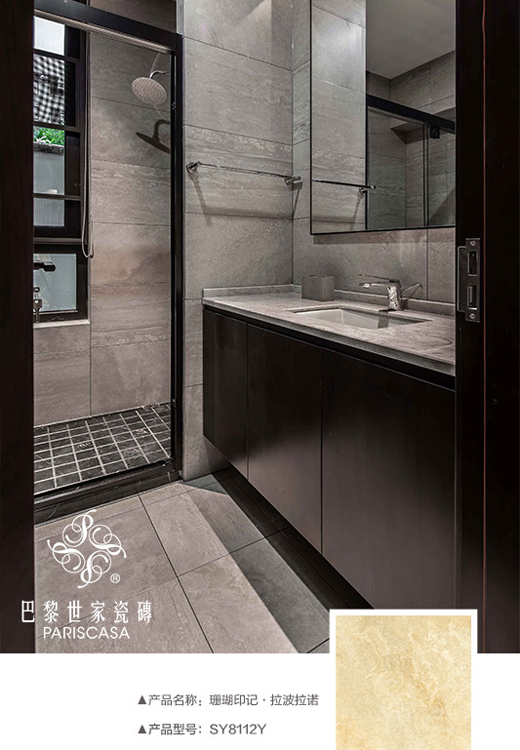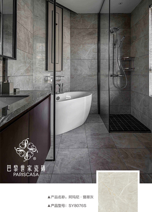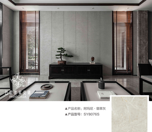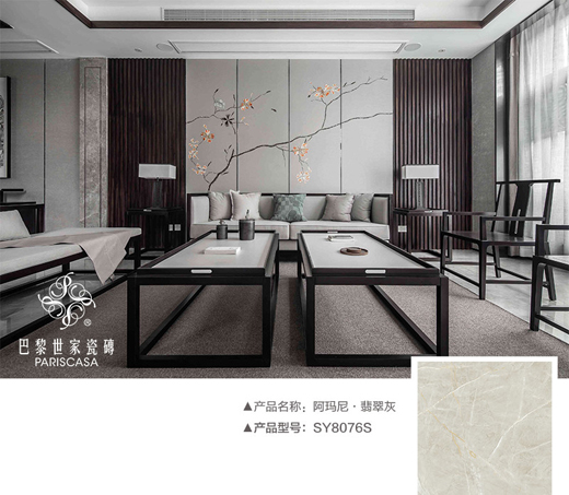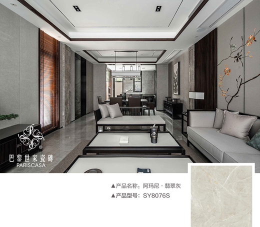 在本案設計中,整體以巴黎世家柔光瓷磚的阿瑪尼·翡翠灰打造高級灰調。通過阿瑪尼·翡翠灰在空間的調和,傳遞新中式風格特有的現代東方感,傳達出設計將自然與生活融為一體的東方哲學思考。