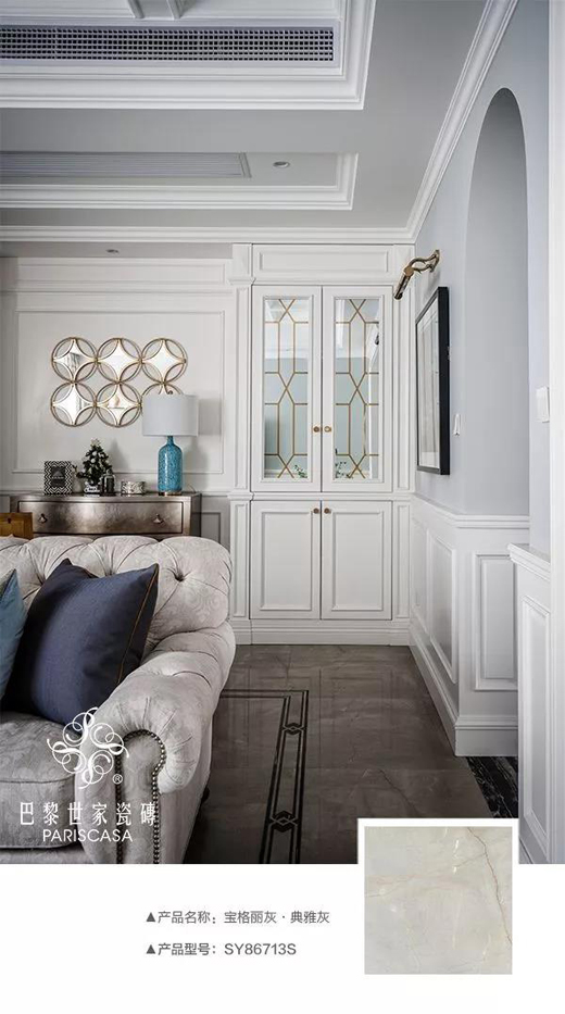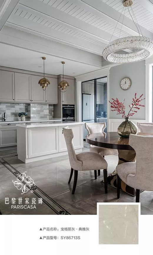 美式風格的設計,用巴黎世家柔光瓷磚的柔和烘托出其精髓。大面積運用寶格麗灰的色調,營造優雅、恬靜的家居環境,同時在不同視角下帶來不同的視覺美感。多種美式元素的共同組建,讓家成為舒適、自然的完美載體,仿佛每一寸柔光、一盞燈都在訴說著優美的故事。