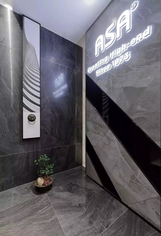 200平米的展廳因為對稱和直線運用而大大增強了空間立體感、流暢感和延伸感。黑白灰色系瓷磚錯落有致的層次應(yīng)用體現(xiàn)了富有東方禪意的極簡美學(xué),簡約、雅致、韻味悠長。