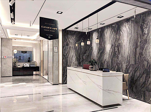 門店大堂使用了卡薩羅夢幻銀灰為收銀臺背景,搭配卡薩羅威尼斯灰的地磚,一股國際奢侈店品的感覺油然而生。黑白灰和線條的裝飾運用讓風尚館更顯個性獨特,開放式的空間設計使空間更顯開闊明朗,為消費者打造理想的生活空間。