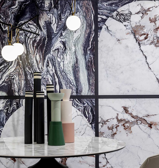 如今,與使用這些材料相關(guān)的大量記憶獲得了新的生命,在Policroma系列板材中的大理石表面和Marmorino石膏顏色的迷人圖案集中得到了獨特的解釋:大型瓷磚表面成為空間的一部分,大理石表面的精致“地理位置”或石膏圖案中的微妙顏色漣漪被放大,不間斷的連續(xù)或由嚴峻的黑暗外圍框架限定。