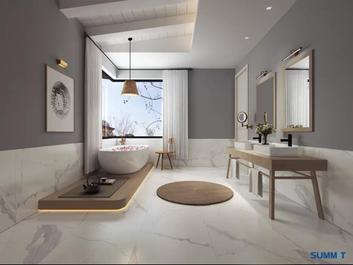 墻面和地面的磚紋理清晰流暢,平穩流動的線條,色澤淡雅光滑,簡約而不失變化,自然而不失時尚,緩慢漸進的形式,在變幻中盡展天然姿容,由遠及近,自上而下,無不讓人神往,整潔清新的環境,使空間表現出一種整體的流暢性。