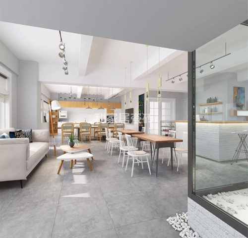 主題餐廳的地板使用的仿古磚產品,表面滄桑自然的斑駁質感、參差不齊的凹凸肌理劃痕效果,搭配雅致的家具,身處此處,內心休閑愜意,充滿快樂感。