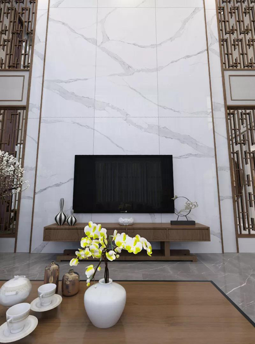當1200×2400mm愛琴海波浪白遇上中式挑空客廳,充分延伸了紋理的美感,更自然逼真,呈現出渾然天成的藝術遐想。