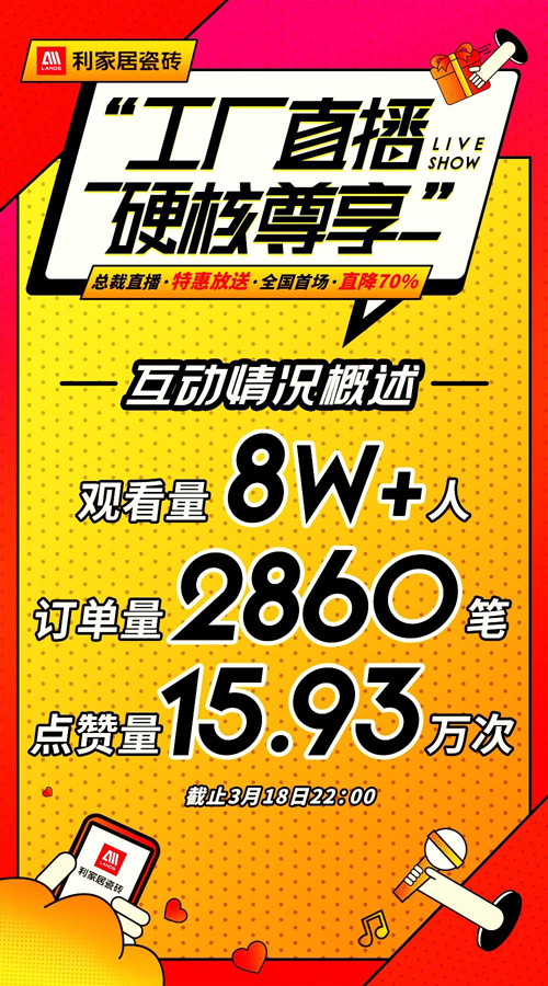 3月份,利家居瓷磚開展了第一場為期12天由總部廠家操盤的全國線上大型直播促銷活動。利家居瓷磚面對嚴(yán)峻的市場環(huán)境,排除萬難為全國終端消費(fèi)者構(gòu)筑美好新家而砥礪前行。
