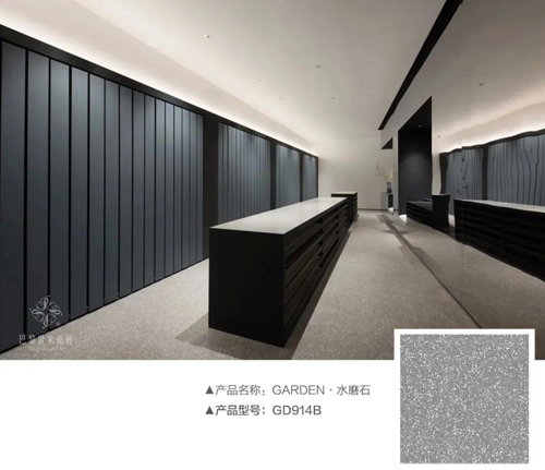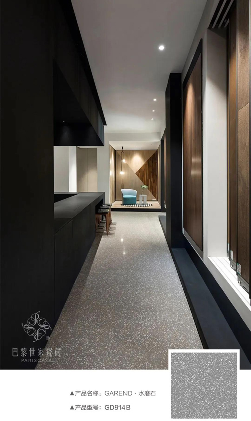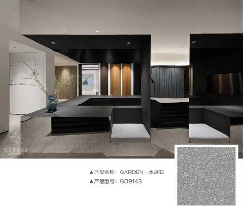 在極簡的黑色魅影中,如璀璨星河的水磨石,給人無窮無盡的想象力,形成對比,自由變化、隨性自在,時尚的氣息流轉,水磨石斑駁陸離的紋理,點綴著完美的視覺空間。