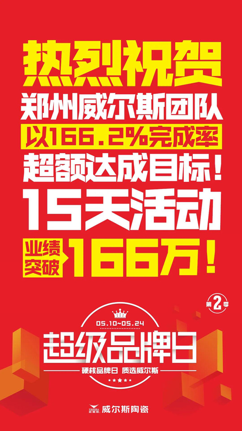 五月,作為建材行業傳統的旺季,隨著五一節假日的結束,建材市場熱度稍微回暖。盡管如此,威爾斯人始終相信,“不努力就是淡季,努力就是旺季“。5月10日,威爾斯總部再度攜手鄭州威爾斯團隊,舉行【超級品牌日】(第2季)促銷活動,以火爆之勢,席卷鄭州市場,再創業績高峰。15天活動銷售業績突破166萬!以166.2%完成率超額達成目標!