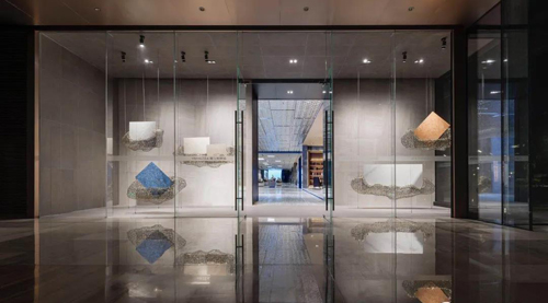 全球營銷中心一樓,通過定制連紋大板產品,運用水紋理與冰川的效果,煥新視覺體驗;高檔的大理石紋理與空間完美合一,抽取水城設計元素,營造出印象派的水城風貌,仿佛置身于浪漫的意大利水都。