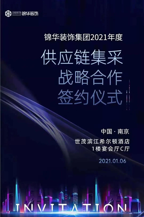2021年1月6日,錦華裝飾集團2021年度供應鏈集采戰略合作簽約儀式,在南京·世茂濱江希爾頓酒店圓滿舉行,薩米特瓷磚與錦華裝飾集團簽署了戰略合作協議,開啟了集采戰略合作新時代。