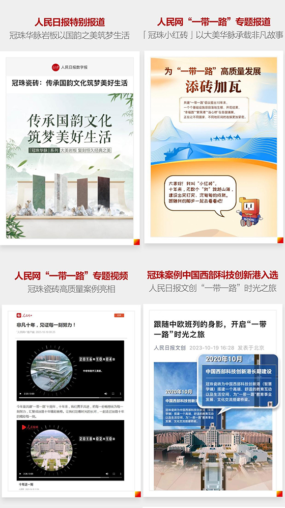 冠珠瓷磚作為民族瓷磚品牌代表,憑借著在綠色低碳發展、數字化建設、承擔社會治理責任、創新中國瓷磚、高質量工作等多維度的亮眼成績獲得人民日報專題宣傳報道,并作為行業唯一代表品牌受邀參與全球矚目的2023“一帶一路”媒體合作論壇,實力獲選人民日報“一帶一路建設案例”