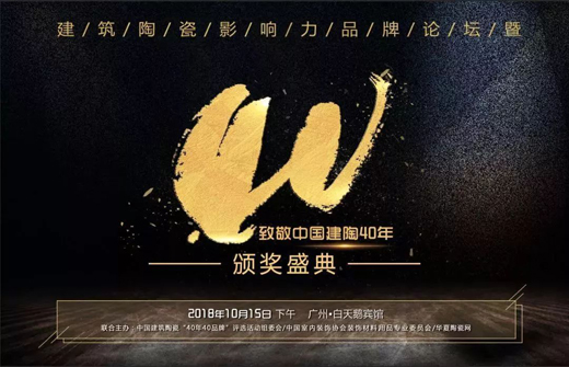 10月15日,由中國建筑陶瓷“40年40品牌”評選活動組委會、中國室內裝飾協會、裝飾材料用品專業委員會、華夏陶瓷網等共同舉辦的建筑陶瓷影響力品牌論壇暨“40年40品牌”頒獎盛典隆重舉行,以檢視“改革開放40年”中國建筑陶瓷行業發展的光輝業績。