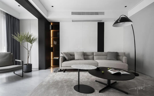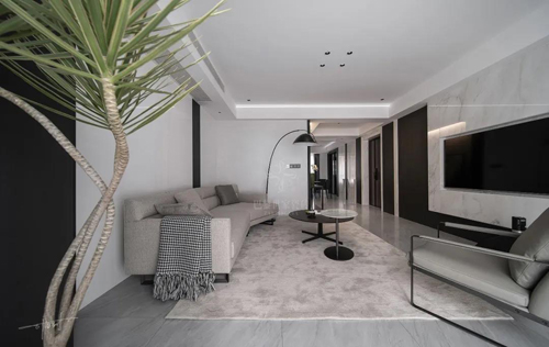 本案例沒有濃重耀眼的色彩和精雕細琢的造型,巧妙運用柔光質感帶來的柔和、平衡,帶來視覺與家居的舒適感,利用黑白灰打造空間層次,多種質感元素拼湊,和諧兼容地構筑空間的品質感。
