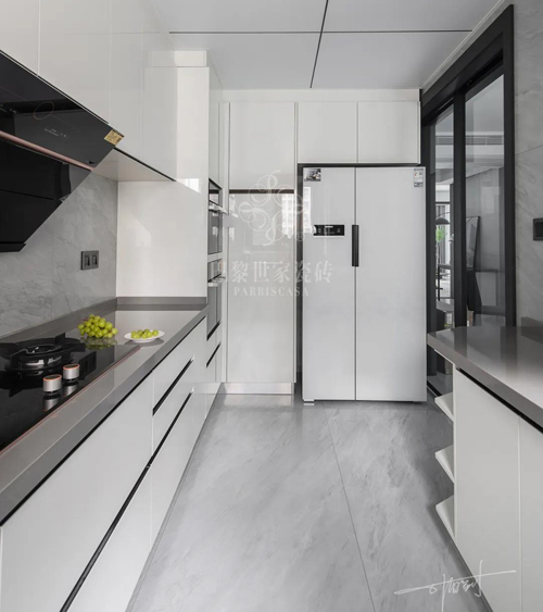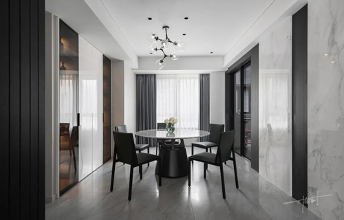 延續客廳的柔雅灰調,純黑與凈白的映襯,讓柔光瓷磚灰色火焰更為生動,波瀾般的紋理演繹說不盡的溫柔,營造溫馨舒適用餐環境。