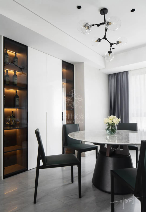 酒柜中暖黃色的燈光揮灑,柔和氣息充滿整個餐廳,巴黎世家柔光瓷磚的細膩紋理,更顯得精致有余。