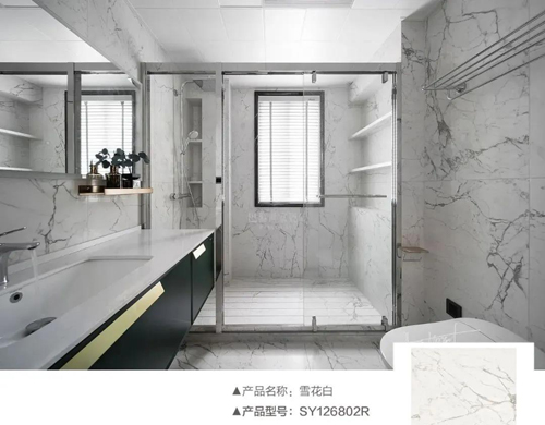 大面積的雪花白鋪設于衛浴空間,潔凈自然的純白基調,明快、流暢的柔和石紋,讓空間節奏都變得自由放松。