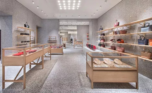 Valentino Flagship Store另辟蹊徑,通過水磨石顆粒大小的對比,以及與墻面的對比,用更簡約寫意的方式玩味水磨石▼