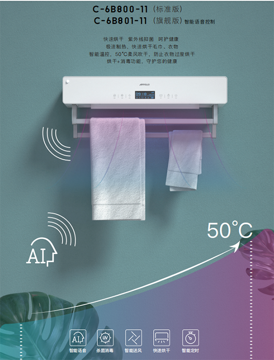 智能語音毛巾架采用語音控制,極速制熱,可快速烘干毛巾、衣物等,同時,智能語音毛巾架還擁有紫外線抑菌、烘干+消毒功能,全方位守護您的健康。