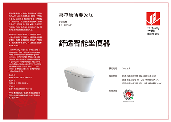 質(zhì)量“奧斯卡”權(quán)威性獎項(xiàng),喜爾康“金獎”品質(zhì)獲行業(yè)高贊家居行業(yè)殿堂級獎項(xiàng)——沸騰質(zhì)量獎,是由6大協(xié)會\質(zhì)量團(tuán)體指導(dǎo),沸騰質(zhì)量數(shù)據(jù)主辦,紅星美凱龍、采筑電商平臺協(xié)辦,19家指定質(zhì)檢機(jī)構(gòu)檢測。組委會秉持客觀、嚴(yán)謹(jǐn)、公正的態(tài)度,嚴(yán)格依據(jù)對應(yīng)品類領(lǐng)域的國家標(biāo)準(zhǔn)(或國際標(biāo)準(zhǔn)、行業(yè)標(biāo)準(zhǔn))作為測評依據(jù),標(biāo)準(zhǔn)整體上高出國標(biāo)和部分行業(yè)標(biāo)準(zhǔn)要求,依據(jù)產(chǎn)品檢測真實(shí)質(zhì)量數(shù)據(jù)進(jìn)行公平、公正評獎,獎項(xiàng)含金量高,所獲獎的產(chǎn)品受到行業(yè)的認(rèn)可及市場的肯定。2021年度測評中,共有200余家國際國內(nèi)主流家居品牌的500余款產(chǎn)品參與測評。喜爾康能夠從中脫穎而出,一舉斬獲五項(xiàng)大獎,特別榮獲最高獎項(xiàng)——沸騰質(zhì)量金獎,是組委會對喜爾康產(chǎn)品實(shí)力的權(quán)威認(rèn)可,更是對喜爾康產(chǎn)品品質(zhì)的強(qiáng)有力背書!用數(shù)據(jù)說話 喜爾康智能馬桶技術(shù)水準(zhǔn)領(lǐng)跑行業(yè) 在本屆沸騰質(zhì)量評選中,喜爾康衛(wèi)浴共有1款產(chǎn)品榮獲“沸騰質(zhì)量金獎”,獲獎產(chǎn)品為智能馬桶HK-9530;2款產(chǎn)品獲得“沸騰質(zhì)量標(biāo)桿獎”,分別為智能馬桶HK-919獲舒適智能坐便器標(biāo)桿獎,智能馬桶P503獲節(jié)能智能坐便器標(biāo)桿獎;2款產(chǎn)品獲得“沸騰質(zhì)量單項(xiàng)獎”,分別為智能馬桶HK9502獲舒適智能坐便器,智能馬桶P310獲節(jié)能智能坐便器。各項(xiàng)性能指標(biāo)卓越出眾,憑借高標(biāo)準(zhǔn)質(zhì)量脫穎而出。舒適性能和節(jié)能性能是消費(fèi)者在選購智能馬桶時最為關(guān)注的重點(diǎn)之一,尤其水溫穩(wěn)定性更是直接關(guān)系到清洗時的舒適度。在質(zhì)檢專家的專業(yè)檢驗(yàn)中,喜爾康HK-9530的水溫穩(wěn)定性達(dá)國家標(biāo)準(zhǔn)2級,表現(xiàn)出色,能夠?qū)崿F(xiàn)舒適清洗的如廁體驗(yàn)。另外,喜爾康HK-9530的坐圈加熱功能以2.14℃的指標(biāo)達(dá)到了國家1級標(biāo)準(zhǔn)。同時,該款產(chǎn)品獲得2021紅點(diǎn)獎,設(shè)計(jì)理念遠(yuǎn)超同行,達(dá)到國際頂尖水平。