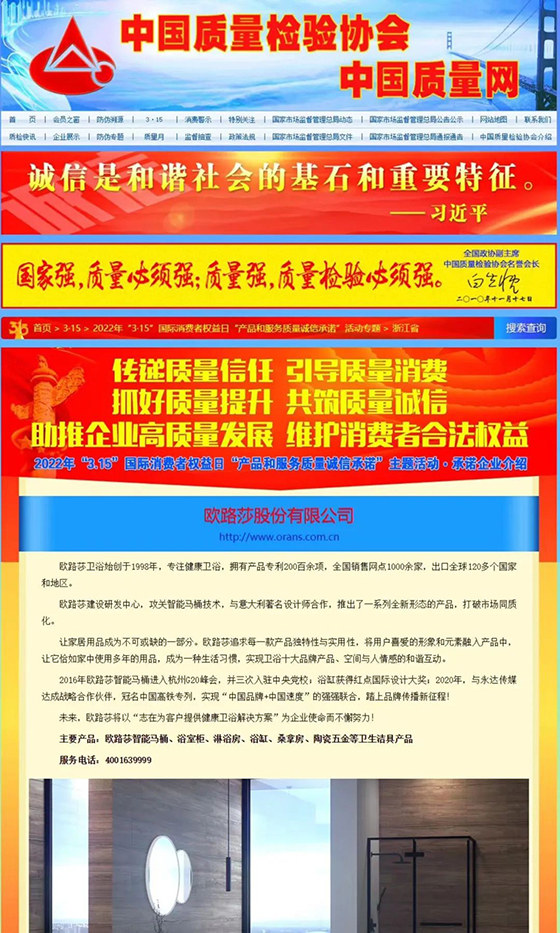 3月15日,在國際消費者權益日到來之際,歐路莎衛浴榮獲由中國質量檢驗協會頒發的“全國產品和服務質量誠信示范企業”“全國衛浴行業質量領先企業”“全國衛浴行業質量領先品牌”“全國質量檢驗信得過產品”四大獎項。