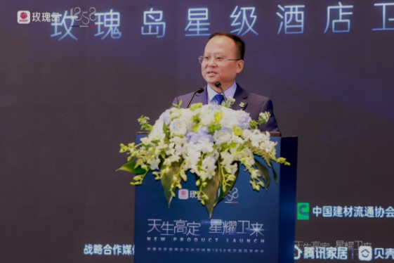 發布會啟幕,由玫瑰島董事長、中山市淋浴房行業協會會長徐偉首開致辭,對蒞臨現場的來賓表達熱烈的歡迎和誠摯的感謝。徐董表示,經過二十多年的發展,玫瑰島已經發展成為具有多渠道、多品牌、多品類并行的企業,也是行業唯一擁有自主全產業鏈的定制家居民族企業,希望業界繼續關注和支持定制家居行業以及玫瑰島的發展。未來,面對酒店業復蘇給玫瑰島帶來新的機遇,玫瑰島將加快步伐,成為參與者,奮斗者和貢獻者。