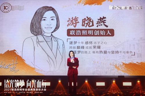 大會在激昂熱烈的燈光秀和開場舞中拉開序幕,在與會嘉賓共同通過《我們的拾光》影集回顧聯浩照明這十年的時光后,聯浩照明創始人游曉燕上臺以獨具匠心的方式與全體聯浩家人們分享了她的心里話,她代表公司對所有嘉賓的到來表示由衷地感謝,她表示:在聯浩創立10周年的新起點上,衷心感謝每一位為聯浩拼搏付出的家人,衷心感謝每一位給予聯浩信任和支持的朋友。讓我們心懷感恩,不忘過往,不畏將來,同心同夢,攜手同行,向下一個十年之約邁進。