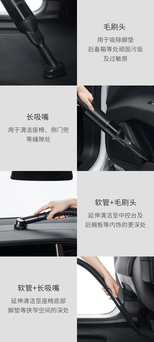 額外加送的多用吸嘴套裝含:毛刷頭、長吸嘴、軟管。應(yīng)對(duì)更多場(chǎng)景,清潔更頑固的污垢及更狹窄的深處空間得心應(yīng)手。