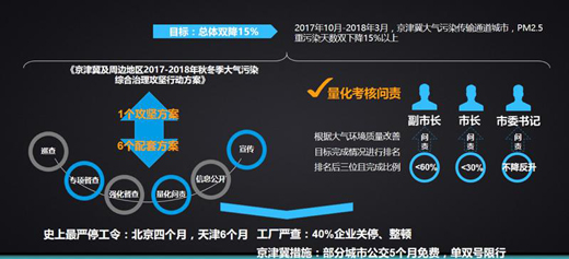 第二個則是人為治理。以北京為首的華北地區在今年加大了空氣污染治理的程度。2017年8月,環保部印發了《京津冀及周邊地區2017-2018年秋冬季大氣污染綜合治理攻堅行動方案》,提出加快散煤污染綜合治理,要求2017年10月底前,各大城市完成以電代煤、以氣代煤300萬戶以上。 很多以能源消耗型為主的工廠倒閉,在很大程度上改善了污染排放情況。以前有人曾言是風吹走了霧霾,而今,即使風變小的時候,污染也很難堆積起來。