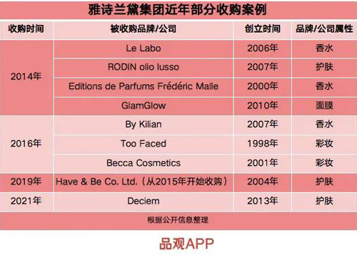 近年來,雅詩蘭黛持續收購多個品牌,涵蓋護膚、彩妝、香水、面膜等品類,從收購金額來看,均低于雅詩蘭黛集團收購Deciem完成后需要投入的總金額。