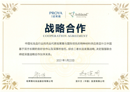 1月22日,珀萊雅化妝品股份有限公司(以下稱“珀萊雅”)與亞什蘭(中國(guó))投資有限公司(以下稱“亞什蘭”)正式簽署戰(zhàn)略合作協(xié)議,國(guó)際化創(chuàng)新研發(fā)再升級(jí)。