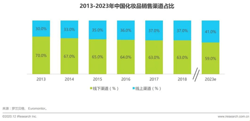 據(jù)艾瑞咨詢發(fā)布的一份報告顯示,近幾年,國內(nèi)美妝護膚品市場線上渠道占比逐年攀升,預(yù)計2023年,線上渠道占比可達41%。