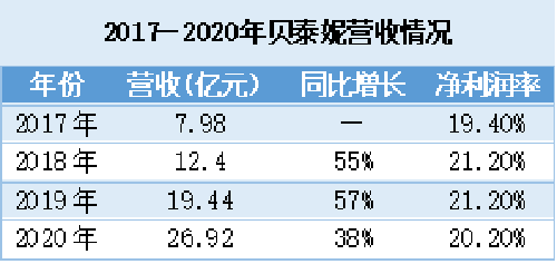 一直以來,薇諾娜對標就是“薇姿”、“理膚泉”、“雅漾”等國際品牌,而人們也對它寄予厚望。但從2020年的業績情況來看,貝泰妮的業績增長明顯放緩,2020年營收為26.92億元,同比增長38%,增速相比于2019年下降了19個百分點,同時凈利潤率也下滑了1個百分點。這雖然有疫情的影響,但背后還是暴露了不少問題。