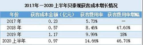 和大部分以線上渠道為主的企業一樣,貝泰妮面臨的最大問題就是流量成本極速上升。從2017年至2020上半年,貝泰妮的獲客成本一直在增長,其中2018年獲客費用率的增幅達到了47.6%,到2019年增幅有所下滑,但在2020上半年增幅又重新回升到了46.7%。而且這還不是貝泰妮一家企業的問題。
