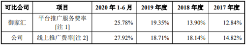 和貝泰妮一樣以線上渠道為主的御家匯,近幾年的獲客成本也一直在增長。據貝泰妮招股書顯示,御家匯在2019年的平臺推廣服務費率為19.35%,同比增長了39%;在2020上半年,平臺推廣服務費率繼續保持了33%的高增長,達到了25.78%。而這項費用大部分是用來從天貓、京東等平臺獲取客流量。