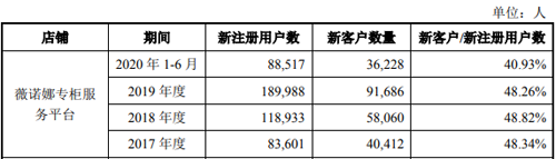 據招股書顯示,從2017年到2019年,薇諾娜專柜服務平臺的新增注冊用戶數一直保持著高速增長,其中2017年的新增注冊用戶數為8.36萬;到2018年則增長到11.89萬,增長幅度為42%;2019年則增長了60%,新增注冊用戶數達到了19萬。截止到2020年上半年,薇諾娜專柜服務平臺在3年半的時間里,一共新增了48.1萬的注冊用戶。