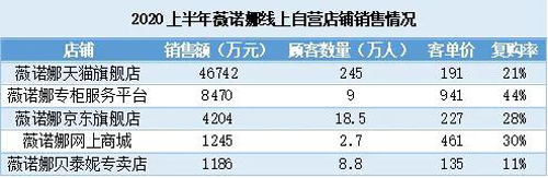 到了2020年上半年,薇諾娜專柜服務平臺的銷售額達到了8470萬元,在所有自營店鋪排名第二,僅次于薇諾娜的天貓旗艦店。而且它的平均客單價達到941元,是所有渠道中最高的,遠高于天貓旗艦店191元的客單價。同時它的復購率也是最高的,達到了44%,是天貓旗艦店的兩倍。