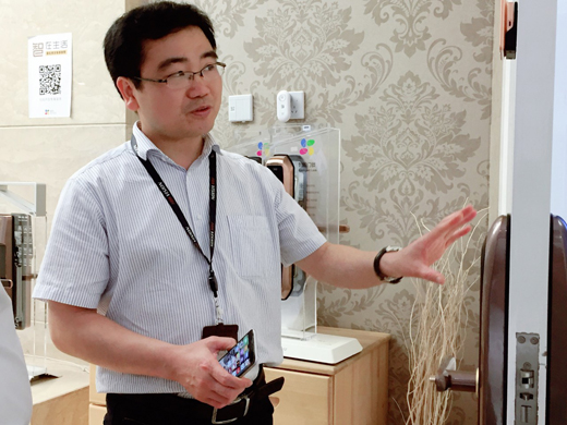 螢石產品總監溫興雙向中國建博葵花獎智能家居考察團一行介紹相關產品