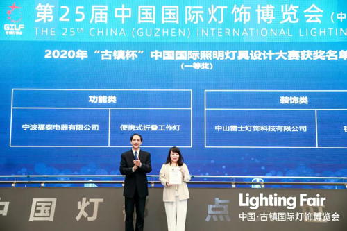 由中山市政協(xié)主席唐穎,古鎮(zhèn)鎮(zhèn)黨委副書記、鎮(zhèn)長阮志力,中國照明電器協(xié)會執(zhí)行理事長劉升平上臺為2020年‘古鎮(zhèn)杯’中國國際照明燈具設(shè)計大賽的獲獎代表頒發(fā)獎牌。