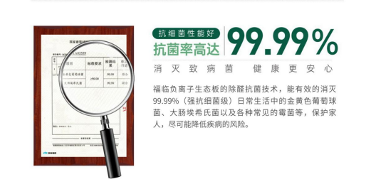 如今,以福臨為領軍品牌的大部分負離子板材生產工藝得到了質的提升,能夠通過持續釋放適量的負離子、呈現小范圍氧吧空間的形式,極大改良現代人居環境。權威統計顯示,負離子實測釋放量達到1500個/cm³,空間內空氣便會很清新,就能對人體產生“有利級”呵護。
