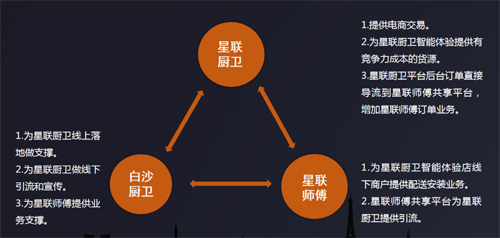 白沙廚衛項目以【一站式品質廚衛裝修超市】為核心,主營衛浴、廚電等家裝產品,是星業公司下屬三大業務板塊之一。白沙廚衛與星聯廚衛、星聯師傅整體相輔相成,各自承載線下銷售、線上結算、配送安裝環節,又共同擔負著銷售配裝結算于一體的功能。根據白沙廚衛項目規劃,一到兩年完成全省市縣級布局、渠道下沉至鄉鎮,三到五年覆蓋全國,總體量超過1000家連鎖門店。