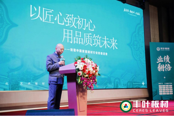 在《品牌布局》環節,豐葉板材副總經理、品牌運營負責人王賽紅先生發表了題為《以匠心致初心,用品質筑未來》的演講。他回顧了豐葉板材從1992年創業至今的奮斗歷程,并分享了豐葉品牌的核心優勢與未來戰略。